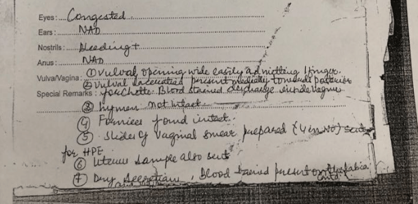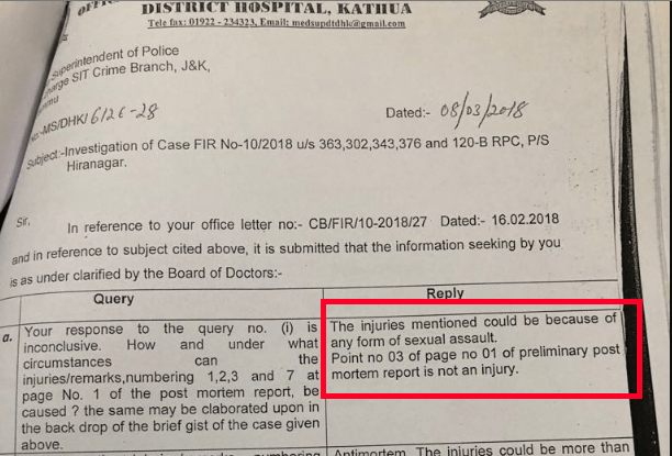 এরপর পুলিশকে দেওয়া কাঠুয়া জেলা হাসপাতালের ডাক্তারদের বয়ান অনুযায়ী “(পোস্টমর্টেম-এ উল্লিখিত) ক্ষতচিহ্নগুলি যেকোনো প্রকারের যৌন আক্রমণের থেকে হয়ে থাকতে পারে”।