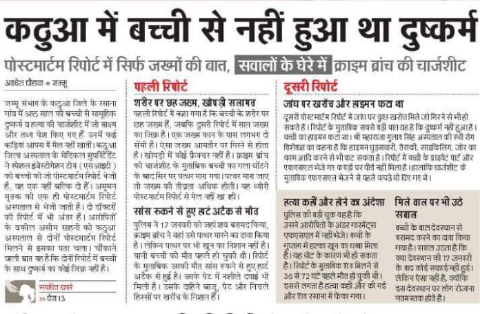অল্টনিউজ-এ প্রকাশ খবর, “(দৈনিক জাগরণের) লেখাটি অনুযায়ী আসিফার শরীরে ক্ষতচিহ্নের অন্যান্য বিভিন্ন কারণ থাকতে পারে। (আসিফার) থাই-এর ক্ষতগুলি উঁচু কোনো জায়গা থেকে পড়ে যাওয়ার ফলে হয়ে থাকতে পারে, যোনির আঘাত সাইকেল চালানো, সাঁতার কাটা, ঘোড়ায় চড়া, ইত্যাদি থেকে হয়ে থাকতে পারে”। এই লেখাটি দৈনিক জাগরণের দিল্লী, আগ্রা, এলাহাবাদ, অমৃতসর, আলীগড়, কাঠুয়া, জম্মু এবং অন্যান্য বহু সংস্করণে ছাপা হয়। “নয়ী দুনিয়া”, দৈনিকি জাগরণ গ্রুপ-এর অন্য একটি কাগজ-এও লেখাটি ছাপা হয়।