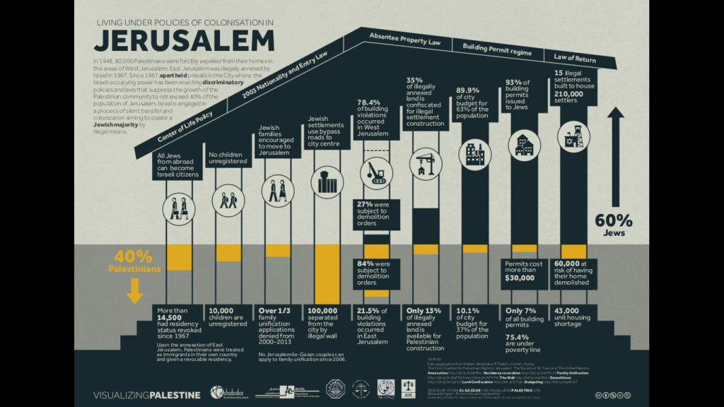 ৩. পূর্ব জেরুসালেম–এ বসবাসকারী প্যালেস্তিনিয়দের “রেসিডেন্স পার্মিট” ও অন্যান্য অধিকার কেড়ে নেওয়া,