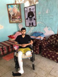 গাজা শহরের ইয়ুসুফ আল্ক্রনেয গ্রেট মার্চ অফ রিটার্ন-এ যান, এবং একটি পা হারিয়ে ফেরেন। ছবিঃ খালেদ তাবাশা।
