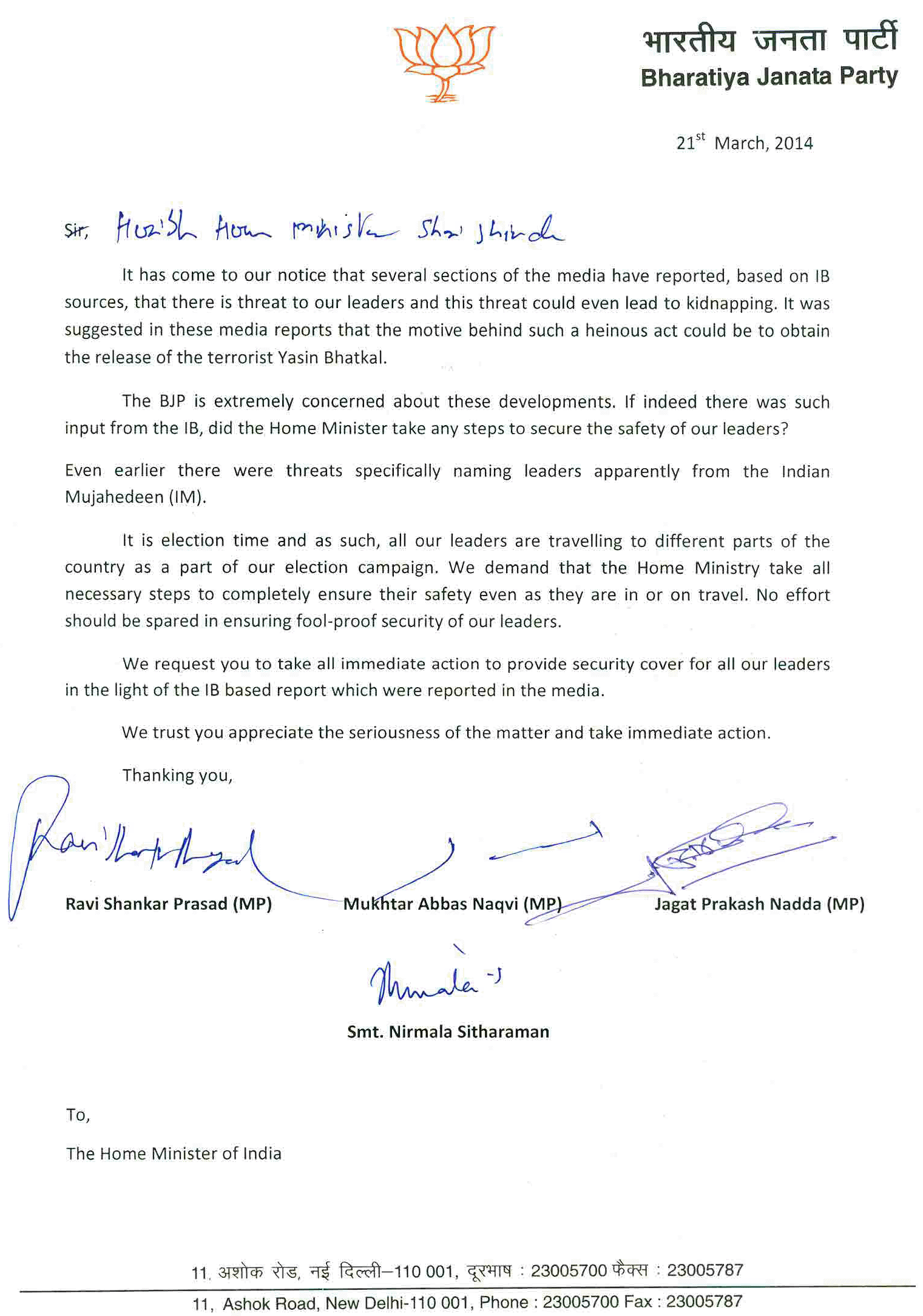 ‘নাম- পরিচয়হীন সূত্র’ উদ্ধৃত করে — মুজাহিদ্দিন জঙ্গিরা নরেন্দ্র মোদী ও শীর্ষ বিজেপি নেতাদের হত্যার পরিকল্পনা করেছে। ২০১৪-র ২০ মার্চ বিজেপি এ-বিষয়ে একটি সাংবাদিক সম্মেলন করে এবং স্বরাষ্ট্রমন্ত্রীকে স্মারকলিপি দেয়। স্মারকলিপিতে দাবি করা হয়,