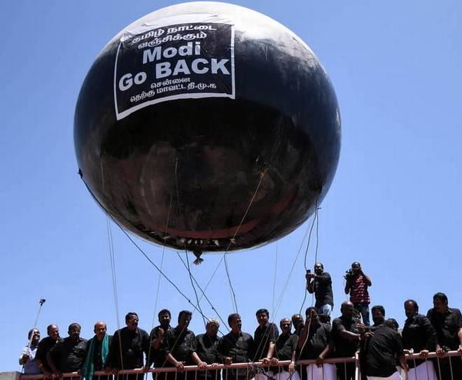 Black flags and balloons bearing the message “Go Back Modi” greeted the Prime minister when he visited Chennai this April. Photo courtesy: K.Pichumani