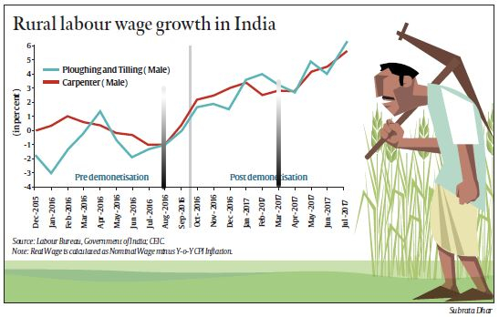 The sharp increase in the wages around November 2013 is largely because of a shift in the methodology of data collection by the Labour Bureau, so we need not spend much time over it here. What is however noteworthy is the steep, almost catastrophic fall in the growth rate of wages in every profession post 2014, including even negatives at times, meaning wages actually fell in real terms instead of growing (let us not forget that this is the same period when Mr. Mukesh Ambani increased his personal wealth from $18.6 billion in March 2014 to $45.4 billion as of July 2018) – something that Mr. Modi and Mr. Jaitley owe an answer for, to the entire country. Arguably, one of the main reasons for the fall, are back to back drought years – about which of course the Government did nothing in terms of relief measures for the economy and therefore the people. The marginal improvement around 2016, though still way below the 2013 rates, can similarly be attributed largely to a good monsoon year overall. However, certain people like Surjit Bhalla, recently appointed to the Prime Minister’s Economic Advisory Council, have attributed this marginal increase in the growth rate of wages to Demonetization! Mr. Bhalla, to his credit staying true to the numbers, used the following graph to prove his point: