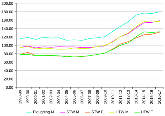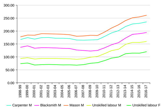 Source: Wage Rates in Rural India, 1998–99 to 2016–17, Arindam Das and Yoshifumi Usami, based on the Labour Bureau survey data