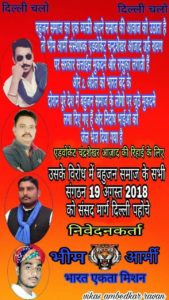 The Bhim Army have given call for a protest meeting in New Delhi on 19th August, in protest of the continued incarceration of Chandrashekhar Azad Ravan, of people arrested during the Bharat Bandh on 2nd April this year in protest of the dilution of the SC/ST (Prevention of) Atrocities Act and organised attacks against dalits, and of those arrested in context of the Bhima Koregaon protests in Maharashtra.