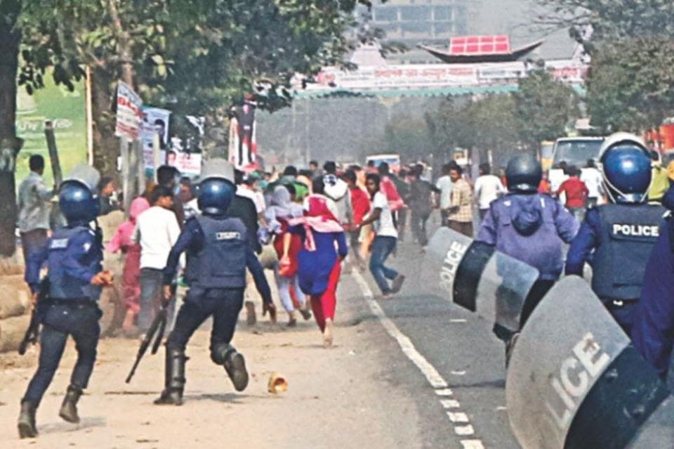 On January 8, police opened fire on the protesting workers. Sumon Miah (22), a finishing section operator of Anlima Yarn Dying Ltd at Ulail of Savar industrial belt, died from a bullet to his chest. Several other workers were also critically injured in the firings. This killing sparked spontaneous anti-police protest demonstrations across the country, led by the workers, in defiance of the traditional Trade Union leadership that tried to convince the workers to get back to work. On January 10, clashes broke out between the police and striking workers in Savar, on the outskirts of Dhaka, and in Gazipur, in which at least 70 persons, including 10 law enforcers, reportedly got injured. Defying brutal armed repression, thousands of workers at Ashulia, Gazipur and Uttara, broke out into spontaneous demonstrations in the labour-intensive industrial belts to press their demand, forcing closure of at least 100 garment factories. “If production halt continues we will be forced to shut factories for an indefinite period,” threatened the BGMEA Vice President Mohammed Nasir. Multiple platoons of the Border Guards were deployed in and around Dhaka to contain the strike.