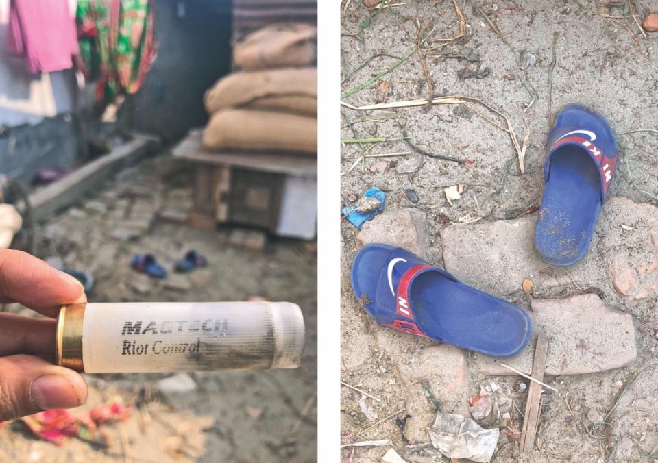 (Left) Shotgun shell found near the murder scene. (Right) The sandals Sumon was wearing the day he died. Photo: Sushmita S Preetha. Courtesy: The Daily Star