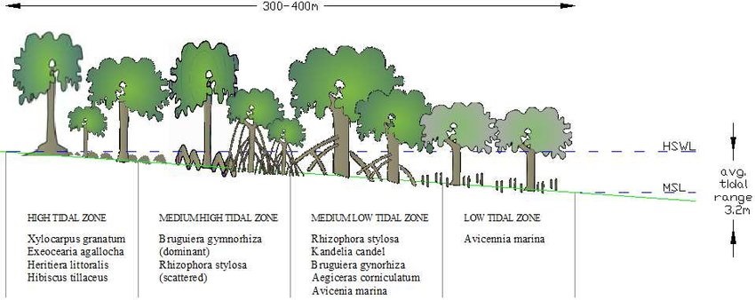 মোহনা অঞ্চলে জোয়ার ও ভাটায় জলের ওঠা ও নামার উপর ভিত্তি করে, ভাটার সর্বনিম্ন জলতল থেকে পূর্ণিমা ও অমাবস্যায় সর্বোচ্চ যেখানে জল ওঠে সেই পর্যন্ত নানান ধরনের ম্যানগ্রোভের স্বাভাবিক বৃদ্ধিকে বলা হয় সাকসেশন। অর্থাৎ ধানিঘাস>বানি>খলসে<>গোলপাতা<>কেওড়া>গর্জন>গরিয়া>কাঁকড়া>ধুঁধুল<>পশুর>সুন্দরী> গেওয়া (নীচে এমন দুটো সাকশেসনের ছবি দেওয়া হল, পরিস্থিতি বিশেষে এরা একটু আলাদা রকম হবে)। এটা পরীক্ষিত যে সুসংগঠিত ম্যানগ্রোভ অরণ্যের গাছের গুঁড়িগুলো যেমন তীরের দিকে ধাবমান জলের স্রোতের গতিবেগ দারুণ ভাবে কমাতে পারে, তেমন তীব্র ঝড়ের সময় বা ভরা জোয়ারে তার জলের বাইরে বেড়িয়ে থাকা বড় ক্যানোপিগুলি উঁচু উঁচু ঢেউগুলিকে আটকে দেয়। ভিয়েতনাম ও নেদারল্যান্ডসে বিজ্ঞানীরা পরীক্ষার মাধ্যমে প্রমাণ করেছেন এমন কোস্টাল ডাইক, যার পিছনে আছে জনপদ, তার সামনে ২০০-৫০০ মিটার এমন লম্বা ম্যানগ্রোভ বন তৈরি করার ফলে ডাইকগুলো অনেক ছোট করলেও চলে, তার উপর বালি, বোল্ডার বা অন্যকিছুর আস্তরণ দেওয়ারও দরকার পরে না ফলে খরচও কম হয়।