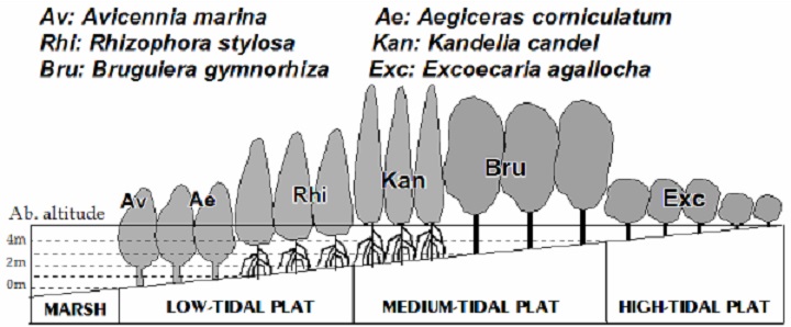 ছবি ১: ভিয়েতনামের তটরেখায় ম্যানগ্রোভের দুটি সাকসেশন, প্রায় একই রকম, একটু প্রকার ভেদ এখানেও দেখা যায় (খ) নাগুয়েন ২০০৮ অনুসারে