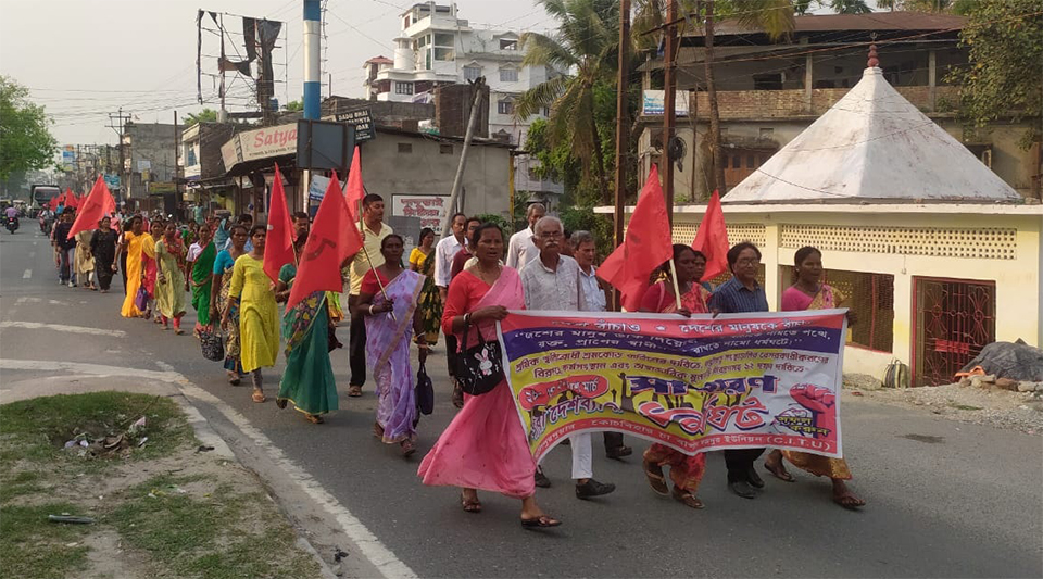 ২৮-২৯ মার্চ দেশজুড়ে ধর্মঘটের পক্ষে বীরপাড়া অঞ্চলে CITU-র মিছিল। রয়েছেন, পরিচিত চা শ্রমিক নেতা জিয়াউল আলাম।