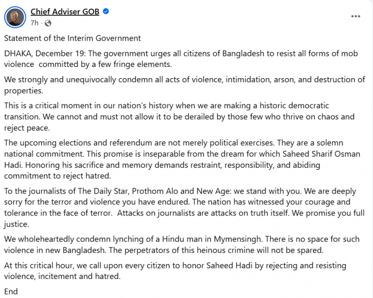 The interim government chief decried the barbarous attack. “We wholeheartedly condemn lynching of a Hindu man in Mymensingh. There is no space for such violence in new Bangladesh. The perpetrators of this heinous crimine will not be spared. At this critical hour, we call upon every citizen to honor Saheed Hadi by rejecting and resisting violence, incitement and hatred,”  (sic)  statement released by the Yunus administration said.