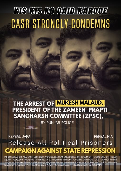 Campaign Against State Repression (CASR) poster condemning the arrest of MUKESH MALAUD