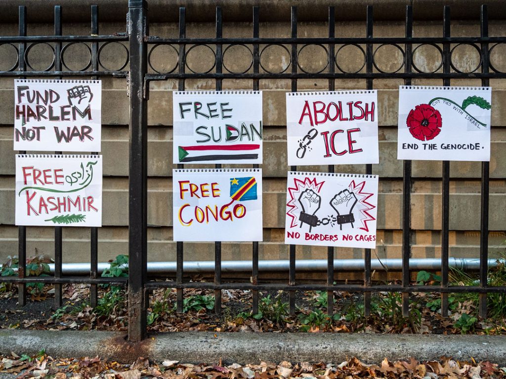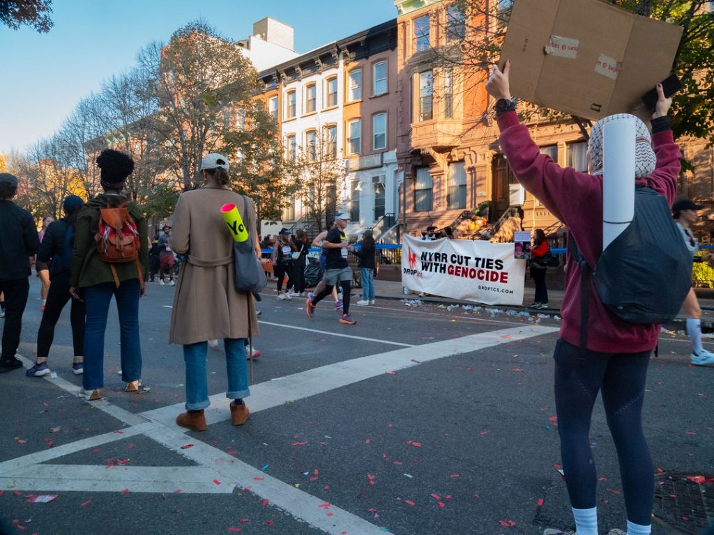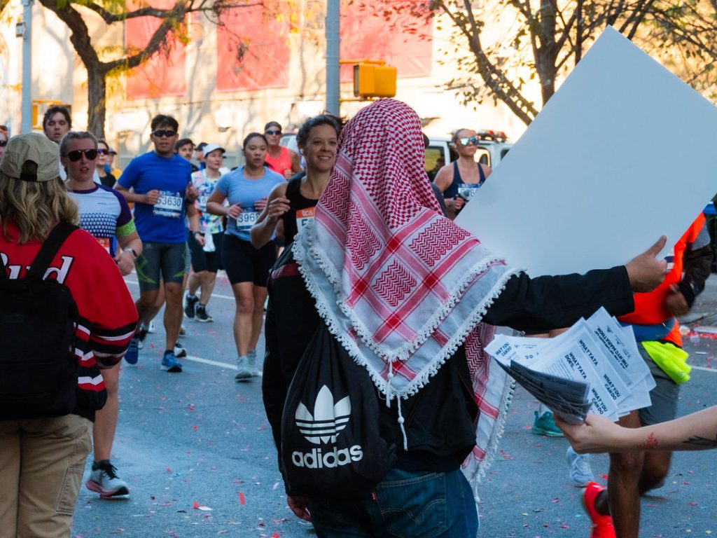 হারলেমে রেস চলাকালীন রাস্তার দু ধারে দাড়িয়ে সংগঠকরা প্রচার করে। শহরের দু জায়গায় এই রকম আয়োজন করা হয়। দৌড়ে অংশগ্রহী অনেকেই ফিলিস্তিনের পতাকা নিয়ে দৌড়য়, বা ছবির কথা মাথায় রেখে হাতে পতাকা নিয়ে ফিনিশিং লাইন পেরোয়। তা ছাড়া শহরের পাঁচটি বরোতেই কোনও না কোনও জায়গা থেকে দৌড়ের পথে বড় ব্যানার ঝোলানো হয়। তার মধ্যে একটার ছবি আগেই দিয়েছি, ব্রংক্স-এ। শেষ করছি ম্যারাথনের রুটে কিছু পোস্টারের ছবি দিয়ে – যার থেকে নিউ ইয়র্কের রাস্তায় বর্তমান লড়াকু এনার্জির খানিকটা ইঙ্গিত পাওয়া যায়। এখানে এক দিকে উঠে এসেছে সুদূর কাশ্মীরের বা সুদানের কথা, আবার রয়েছে ট্রাম্পের অভিবাসন সংক্রান্ত অ্যারেস্টের বিরুদ্ধে প্রতিবাদ।