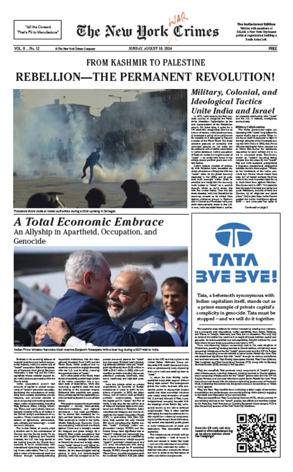 Writers Against the War in Gaza” নামক একটি নতুন সংগঠন The New York Times-এর প্রচ্ছদকে ব্যঙ্গ করে তাদের পত্রিকা The New York War Crimes চালিয়ে যাচ্ছে। ২০২৪ সালের ১৮-ই আগস্টের সংখ্যাটি সালামের সদস্যরা যুগ্ম সম্পাদনা করে, এবং ভারত-ইজরায়েল সম্পর্কের ব্যাপারে বিভিন্ন লেখার মধ্যে “টাটা বাই বাই” আন্দোলনের ইশতেহার ছাপায়। আগ্রহী পাঠক পুরো সংখ্যাটা এখানে পড়তে পারেন।