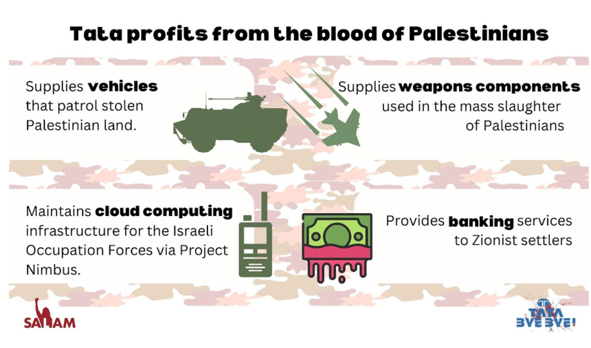 দীর্ঘ রিপোর্ট প্রকাশ করার সাথে সাথে সালাম নিউ ইয়র্কের People’s Forum-এ একটি আলোচনার আয়োজন করে। তাদের সেখানে প্রস্তুত করা একটি স্লাইডের ছবি উপরে দিলাম। রিপোর্টটাকে তারা চার ভাগে বিভক্ত করে টাটার ইজরায়েলের সাথে বিভিন্ন ধরনের সম্পর্কের ডিটেলে বিবরণ দিয়েছে। তাদের বয়ানে টাটারা ইজরায়েলি সেনার সাথে যানবাহন নিয়ে ব্যবস্যা করে। যেমন, টাটা মোটর্স – এর অধীনস্ত জাগুয়ার কোম্পানির ল্যান্ড রোভার গাড়ির চ্যাসিস বা মূল কাঠামোটা  ইজরায়েলি সৈন্যবাহিনীর টহল গাড়িতে ব্যবহারিত হয়। সেই আরমার্ড গাড়ি নিয়মিত ফিলিস্তিনিদের নির্যাতনে ইস্তেমাল হয়। দ্বিতীয়ত, টাটারা বিভিন্ন ধরনের অস্ত্রের অংশ সাপ্লাই করে ইজরায়েলর নৌবাহিনী ও বিমানবাহিনীকে, সালামের অভিযোগ। তৃতীয়ত, ইজরায়েলি সরকারের ক্লাউড কম্পিউটিং সংক্রান্ত ১২ লক্ষ ডলারের “প্রজেক্ট নিম্বাস”-এর মধ্যে আরও পাঁচটা কোম্পানির মাঝে টাটাও আছে। তদুপরি টাটা কনসালটেন্সি সার্ভিসেস ইজরায়েলের ব্যাংকিং সার্ভিসেস ব্যুরো (BSB) -টা চালায়। এটি একটি ডিজিটাল ব্যাংকিং প্লাটফর্ম, এবং ইজরায়েলের সমস্ত বড় ব্যাঙ্ক এটার মাধ্যমেই কাজ করে। অর্থাৎ সাম্রাজ্যবাদী ও গণহত্যাকারী পুঁজির পথ টাটার প্রযুক্তির মাধ্যমেই, এমনটা লিখছে রিপোর্টে। সম্পূর্ণ রিপোর্টটা পড়লে আরও অনেক চাঞ্চল্যকর তথ্য পাওয়া যায়।