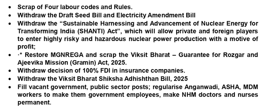 The strike has broadened beyond traditional labour demands to encompass farmers’ concerns and opposition to recent trade and policy decisions. Unions and farmers’ organisations have jointly opposed the Draft Seed Bill, the Electricity Amendment Bill, and the decision to allow 100 per cent FDI in insurance. Agricultural workers’ unions are mobilizing rural workers with a special focus on the demand to restore the Mahatma Gandhi National Rural Employment Guarantee Act (MGNREGA).