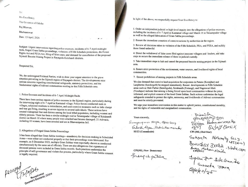 A group of Left political parties has written to the Governor of Odisha, raising serious allegations of police excesses, constitutional violations, and coercive resource extraction in the Sijimali region, and demanded his immediate intervention, including the cancellation of the bauxite mining project by Vedanta Limited.