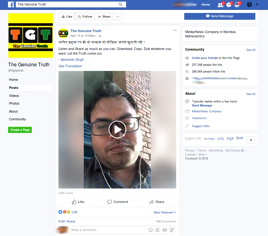 “The Genuine Truth” নামের পেজটিতে ১৩ই এপ্রিল অভিষেক সিংহ নামের ব্যক্তি একটি ভিডিও বার্তায় দাবী করেন আসিফা খুন হয়েছে কিন্তু ধর্ষিত হয়নি। তাকে ৮ দিন ধরে মন্দিরে আটকে রেখে খুন করার খবর একটি অপপ্রচার। আসলে ৮ দিন আগেই তাকে মেরে ফেলা হয়েছিল এবং যেদিন তার শরীর মন্দিরের মধ্যে পাওয়া যায় সেইদিন-ই তার মৃতদেহ ওই মন্দিরে ফেলে রাখা হয়েছিল। এবং এইসব-এর পিছনে আছে রোহিঙ্গ্যা সম্প্রদায়।