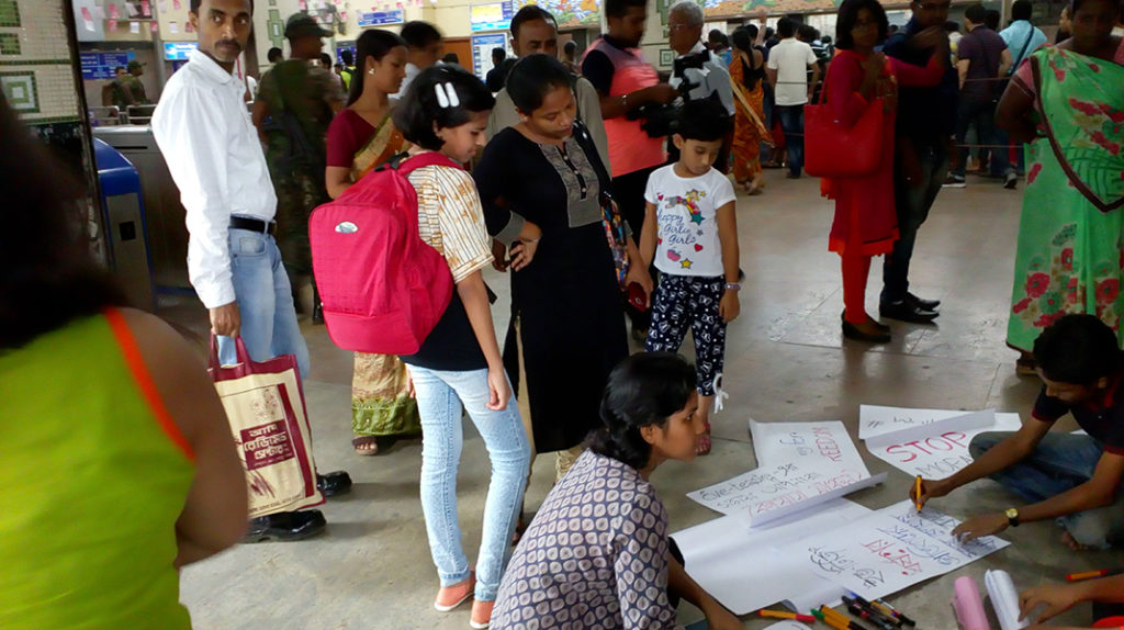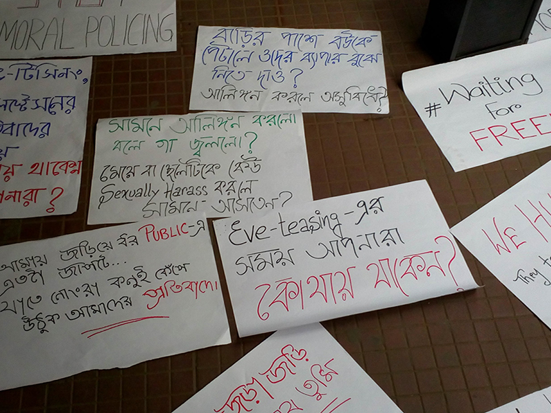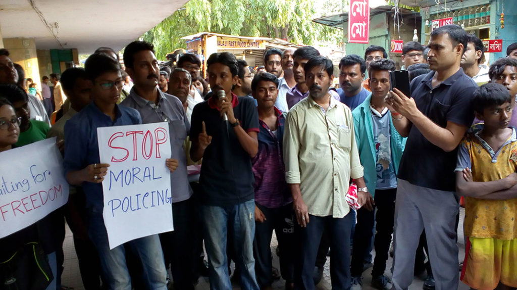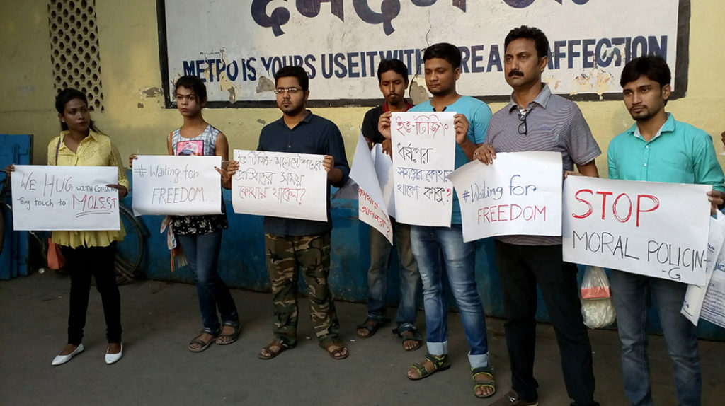 Almost 250 people gathered raising their voices against the Dumdum Metro moral policing incident, on a Facebook call by the event hosts of #waitingforfreedom. Protests continue in the face of further attempts of harassment and lack of cooperation of the Police.