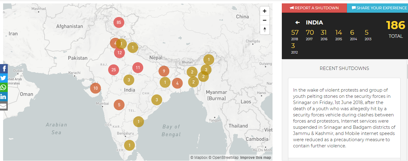 The Software Freedom Law Center database documents such instances where the Government is resorting to suspension of internet services (all disruption mentioned here are of blanket ban of internet). The reasons cited are mostly “breakdown of law and order” that might worsen due to circulation of rumors and misinformation. In India, between January 2012 and 22nd May 2018, there have been 181 internet blackouts (including both wired and/or mobile connection) for various reasons, across 20 states in the country. In 2017 and 2018 (till 22nd May) alone, there have been 70 and 52 internet blackouts, respectively. While the time period of these internet shutdowns vary, the frequency of blanket bans has increased over this period. This includes situations like communal tension and riots, as well as dissent or protests, such as in case of Thoothukudi, the recent Gorkhaland Agitation or the perpetual bans in Kashmir.