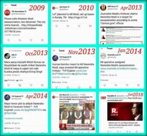 Come 2014, in the month of March just prior to the polling for the General elections, again 4 terror operatives were arrested from Rajasthan. It was claimed that these were out on with a plan to kill the BJP’s Prime Ministerial candidate Narendra Modi. Prior to this, from November 2013 to January 2014, several media outlets such as TV9, OneIndia, and even ANI, reported that Indian Mujahiddeen terrorists are out to kill Narendra Modi and other senior BJP leaders, quoting mostly “unnamed sources”. On 20th March 2014, the BJP citing these media reports, conducted press meets and sent a delegation to meet with the Home Minister to submit a memorandum, which read: “It has come to our notice that several sections of the media have reported, based on IB sources, that there is a threat to our leaders and this threat could even lead to kidnapping. It was suggested in these media reports that the motive behind such a heinous act could be to obtain the release of the terrorist Yasin Bhatkal.” Interestingly though, the news reports which had triggered these news conferences and memorandum to the Home Ministry, are nowhere to be found anymore. The only such report now appears on Niticentral, a BJP mouthpiece. Nirmala Sitharaman’s press conference and Ravi Shankar Prasad’s interview to the press after submitting the memorandum were carried prominently but no channel or newspaper bothered to dig up the media reports which had indicated the existence of such alerts and threats. Though the major plank for BJP’s election campaign in 2014 was “development” and “Gujarat Model” spearheaded by Narendra Modi, Hindutva agenda was also on the cards. Here as well, the election campaign was around the personalised image of Narendra Modi. The lurking danger around him fitted well with BJP’s narrative of Anti-India forces getting uncomfortable with his increasing popularity and thus there were threats around his life.