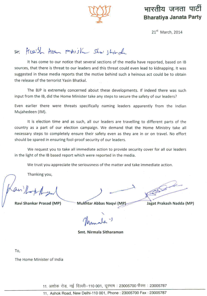 Memorandum to Home Minister to provide security cover to BJP Leaders