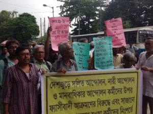 Standing by Lenin’s statue in Esplanade, waiting for the rally to start, Tapas Chakraborty, office bearer of APDR and CDRO, spoke to Groundxero about his experience working with those arrested in the course of a recent fact-finding mission to Gadchiroli, Mahashtra. After the encounter killing last month of 40 alleged Maoists at one go by security forces in Gadchiroli, a large team of human rights activists had visited to conduct an independent study of what had occurred. [Their report can be viewed here, and our Bangla summary here.] Four of those arrested – Sudhir Dhawale, Surendra Gadling, Mahesh Raut and Rona Wilson – were part of the fact-finding team, and the fifth, Shoma Sen, had hosted them while they were en-route. It is difficult to think, he said, that just last month we were together for 4-5 days, and now suddenly they are behind bars! With these arrests the state is in effect doubling down on human rights violations by targeting those fighting for human rights.