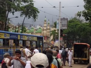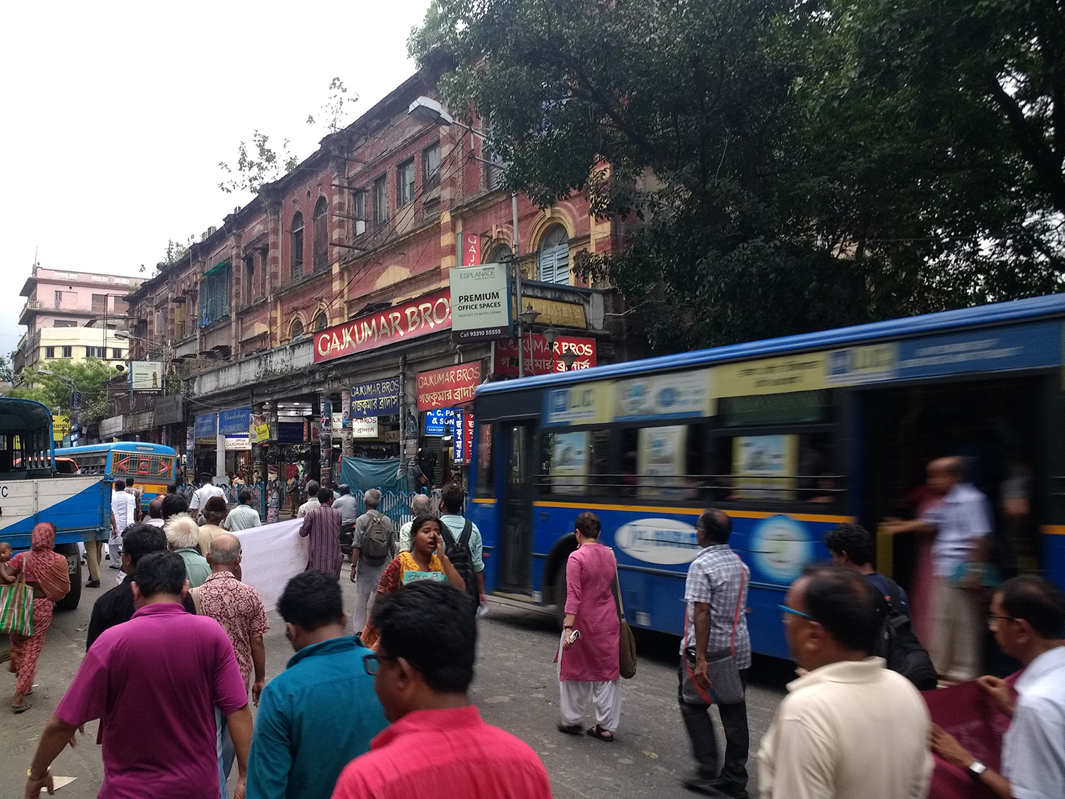 The rally started and marched along to a variety of slogans – announcing the march and its intention to continue, different ones calling for the unconditional release of the five activists arrested – highlighting their individual work, demanding answers from the Modi government on the rationale for the arrests, stating that we will not accept these unjust actions of the state, stating that we will not accept BJP’s capitalist conspiracies, calling for the burning down of the UAPA, calling out the false Maoist ruse for the arrests, refusing to bow down to a fascist state, refusing to bow down to state terror, calling for the release of Alik Chakraborty – arrested in connection with the struggle against a power grid in Bhangor, and calling out discrimination against religious minorities, adivasis, women, and dalits. Kolkata police were diligently taking photographs, and had also arranged a vehicle with a video camera facing the rally to go along in front throughout the march. Slogans inevitably veered against this in-your-face surveillance. In a little over thirty minutes the rally made its way by blocking arterial roads and through small streets to reach Bowbazar Bank of India crossing. Arrangements had been made there for speeches from a podium at the street corner, and some chairs for people to sit in. Speakers came up one after another in the by now pouring rain.