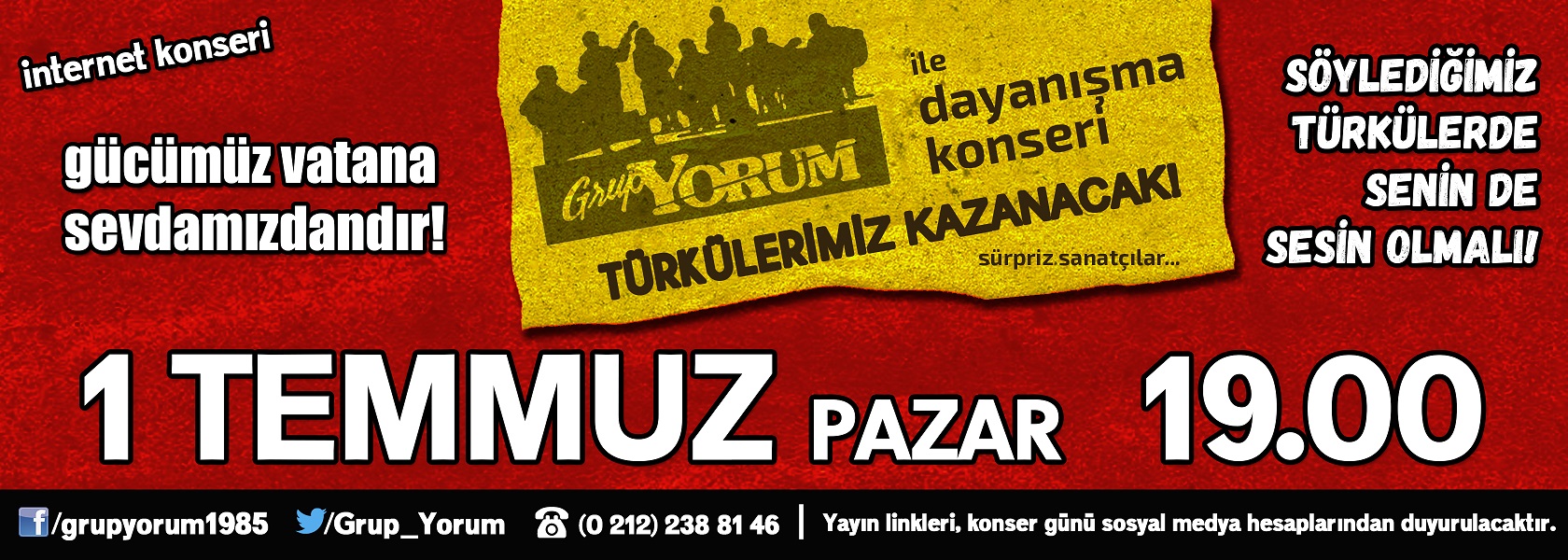 The days when we will again pack the fields with millions of souls are close. We resist the fascism with this belief and now we will be again in front of you with an Internet concert. We addressed our people from the roofs of the poor neıghbourhoods. We got on a lorry and made our marches echo street by street. As for today, it is time to show the fascism the power of Grup Yorum once again. You can attack as as much as you want, but we are coming, resisting, growing and producing!
