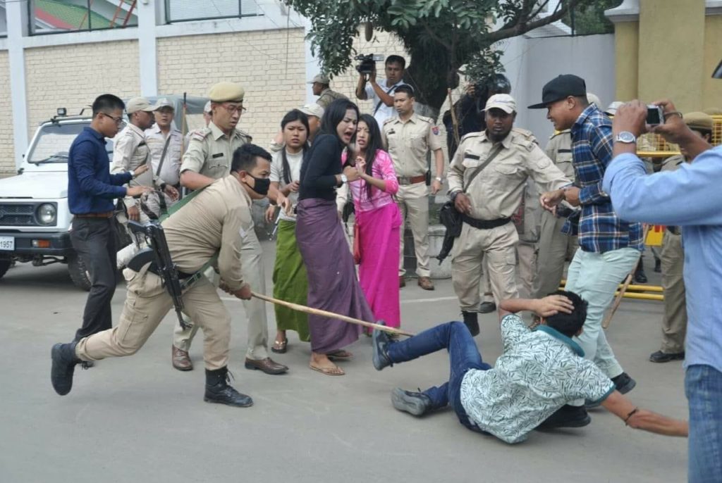 CM Nongthombam Biren Singh told the media that the Revolutionary People’s Front (RPF) demanded 5 crore Rupees from VC Pandey and that the office of the Assistant Director was burnt in relation to this matter. The attempt was to create the impression that MUSU is striking at the behest of insurgents. The narrative fizzled out because no relationship could be established between these events and the ongoing student struggle. MUSU alleges VC’s supporters burnt the ADS’s office as a part of their larger plan to brutally crack down on the movement, by bringing armed forces into the campus. When sticks did not work, carrots were thrown – MHRD announced a fact finding committee to look into the matter on the 40th day of the strike. It consists of JK Tripathi, Joint Secretary of UGC and Surat Singh, Deputy Secretary MHRD. It was later expanded to include Former Chief Justice of Meghalaya, T Nandakumar. The committee consists of VC’s friends and a retired judge without any power, according to the students. The university community announced that it will not cooperate with the fact finding committee, rejecting the effort to dilute the movement. When negotiations failed, students started protesting in various places in the Imphal Valley. The movement intensified further when police launched an all-out brutal attack on students protesting simultaneously at the gate of Kangla Fort, Chief Minister’s bungalow, gate of Raj Bhavan and BJP Manipur Pradesh’s main office at Imphal on 16th July. Sital Oinam, General Secretary of Democratic Students’ Alliance of Manipur sustained serious injuries on his left arm, after he fell under a moving truck when police personnel pushed him in front of BJP’s office.
