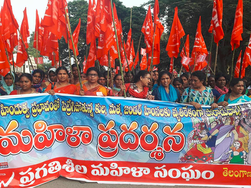 This year POW has been involved in agitating around the ongoing casting couch controversy in the Telugu film industry that was thrown open by the actor Sri Reddy, who spoke of different prominent personalities offering her roles in exchange for sex. In her article in the latest (June 2018) issue of the Telugu POW organ, ‘Matruka’, V Sandhya writes about the recent mass encounter killing of alleged Maoists in Gadchiroli, Maharashtra, and broadens the conversation to speak of the social death inflicted on women in different ways, and the need to fight it. A range of organisations – IFTU, PDSU, POW, PYL, AIKMS, Arunodaya – came together and organised a meeting in solidarity with her on 19th July.