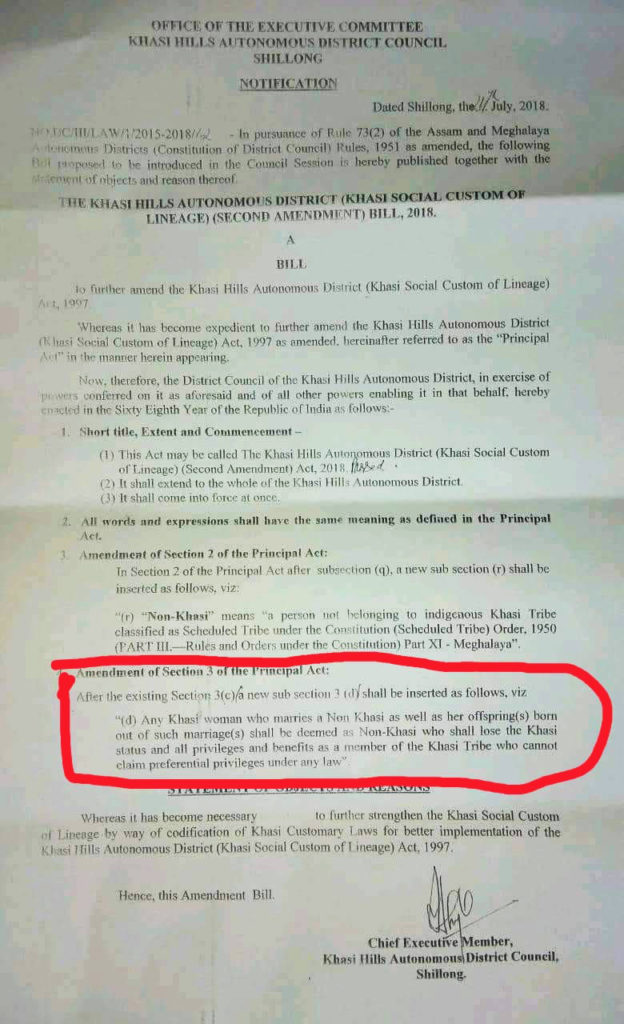The KHADC amended Section 3 of the Khasi Hills Autonomous District (Khasi Social Custom of Lineage) Bill, 1997. After the existing Section 3 (c), a new sub-section 3 (d) shall be inserted, which states, “Any Khasi woman who marries a non-Khasi as well as her offspring(s) born out of such marriage(s) shall be deemed as non-Khasi who shall lose the Khasi status and all the privileges and benefits as a member of the Khasi tribe who cannot claim preferential privileges under any law.”
