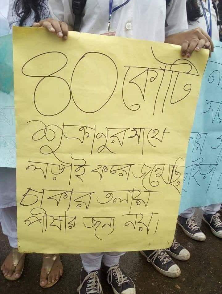 - এই ছেলেমেয়েরা নিজেদের দেশ সম্পর্কে ওয়াকিবহাল। ওরা দেশের ইতিহাসটা জানে হৃদয় দিয়ে, কেবলমাত্র ক্লাসের পাঠ্যবইয়ের মুখস্থবিদ্যা দিয়ে নয়। তারা জানে যে সরকার, প্রশাসন মিলে ক্ষমতাসীন থাকার জন্য ঠিক কোন খেলাটা খেলে, খেলছে। কীভাবে তারা দেশবাসীকে শোষণ ক’রে, তাদের যাবতীয় সুবিধা-অসুবিধাকে বুড়ো আঙুল দেখিয়ে নিজেদের স্বার্থ কায়েম রাখে। তাই তারা রেগে উঠেছে। তাই তাদের মুখের ভাষাকে মনে হচ্ছে অশালীন, যখন তা পোস্টারে লেখা হয়ে যাচ্ছে। কিন্তু যদি আমাদের রাজনীতির মহারথীদের ভুয়ো আশ্বাস আর প্রতিশ্রুতিকে অশালীন মনে না হয়, তাহলে এই সৎ পড়ুয়াদের পোস্টারের ভাষাকেও মনে হওয়া উচিৎ নয়। আপাতত ক্ষোভ প্রকাশের আর সত্যিটা বলার এর চেয়ে স্পষ্ট ভাষা কিছু হতে পারে না।