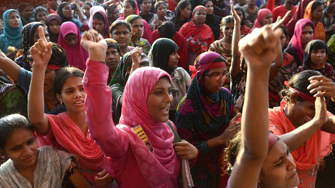 Bangladeshi garment workers shout slogans during a protest on wage increases in Dhaka on September 21, 2013. (AFP Photo / Munir Uz Zaman) / AFP