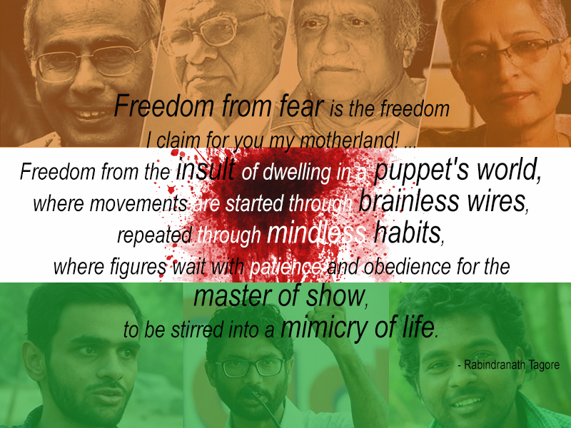 Be it Dadri or JNU or Jadavpur [University] campus, our freedom of expression is facing brutal attack every day. Even the last fig-leaf of so-called secularism is falling off. Progressive scientific outlook is being attacked. All avenues of rational and cerebral intellectual exercise are being obstructed. The bodies of Dabholkar, Pansare, Kalburgi and Rohith Vemula lie like corpses of our own awareness and sensitivity, as question marks on our intelligence, conscience and consciousness.