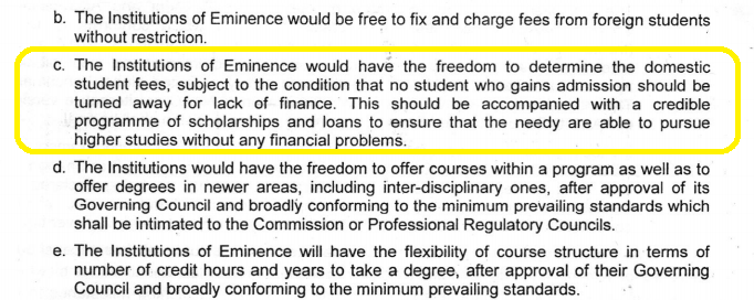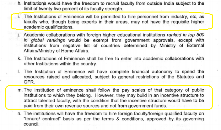 It is not surprising that such marketization of higher education promises to have deep irreversible impacts not only on students, but also on the faculty and researchers employed by these Institutions. Though the government pay scale is applicable for the IoEs, the institutes are allowed to develop their own pay scale for attracting ‘foreign faculties’ through raising their own funds. The IoE notifications indicate that money for this is to be raised from alumni, industry and other forms of donation, constituting a decisive push towards self-financing, even for public institutions. The direction on hiring also points towards greater control of the industry, allowing hiring of “personnel from industry, etc. as faculty, who, while being experts in their areas, may not have the requisite higher academic qualifications.”