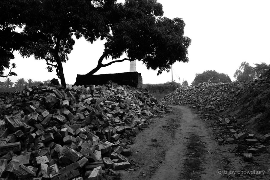 Looking at the brick fields through the lens over the past few years, the photographer has tried to provide acute attention to the diabolical conditions of the brick kiln workers. Wages paid were as low as Rs. 20-30 per day. The brick field owners mandate 12-14 hour work-days under the scorching sun, enveloped with dust clouds and smoke all around, often causing critical diseases like Tuberculosis, Diarrhea, Bronchitis and skin problems among the workers. The skyscrapers of modern ‘world power’ India are literally built out of rectangular blocks of  blood, sweat and dreams of kiln workers.