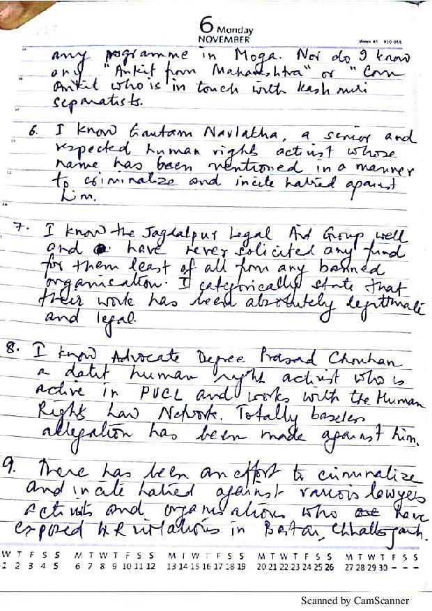 ৬. হ্যাঁ, আমি গৌতম নওলাখাকে চিনি। তিনি একজন বরিষ্ঠ সম্মানিত মানবাধিকার কর্মী। তাঁর নামটাও এমনভাবে উল্লেখ করা হয়েছে যেন তিনি একজন অপরাধী, যাতে করে তাঁর প্রতি জনমানসে ঘৃণার আবহ তৈরি হয়।