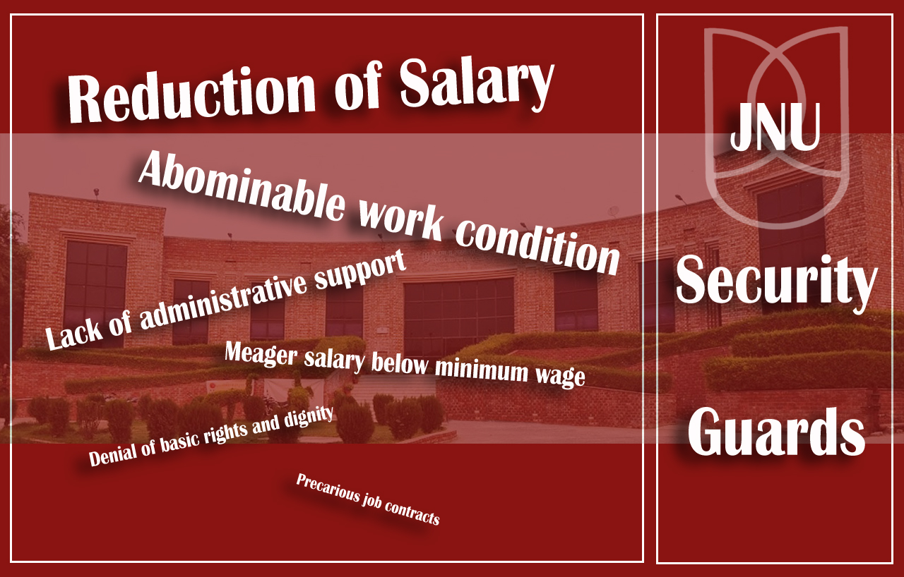 However, as per Labour Laws in India, any dispute related to wages needs to be addressed by the Principal Employer, which, in this case is the JNU administration. Therefore it is the university administration that remains answerable for this unjustified reduction of the already meager salaries. It must also be noted that as ‘providing security to the campus’ is a permanent nature of work, the university cannot employ contract security guards in this job, according to the Contract Labour (Regulation & Abolition) Act, 1970.