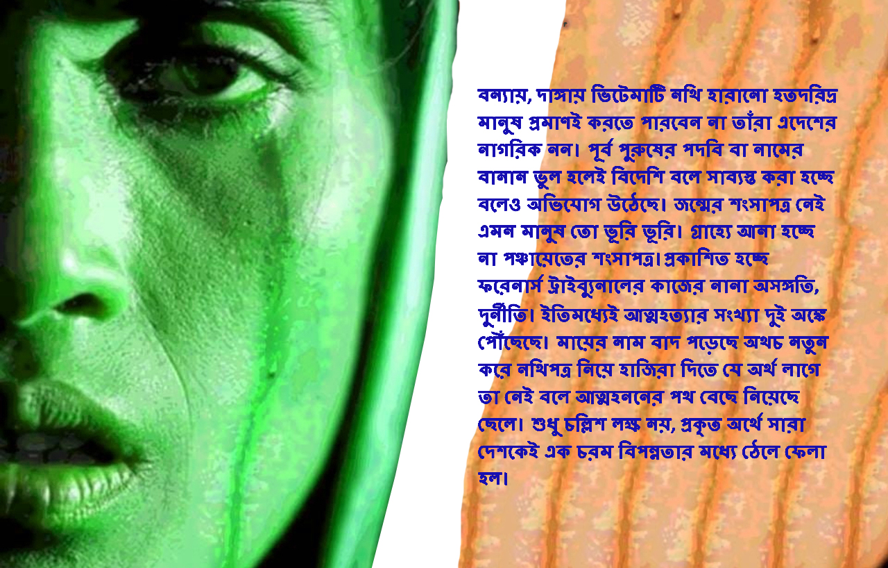 নানা সূত্রেই বার বার এ কথা উঠে এসেছে যে বন্যায়, দাঙ্গায় ভিটেমাটি নথি হারানো হতদরিদ্র মানুষ প্রমাণই করতে পারবেন না তাঁরা এদেশের নাগরিক নন। সংবাদপত্রের বিভিন্ন প্রতিবেদনে বার বার সে তথ্য উঠে আসছে। মুসলিম মহিলাদের ক্ষেত্রে পদবির হেরফের হয়। সাধারণ ভাবে অবিবাহিতা খাতুন হলে বিয়ের পর তিনিই বিবি কিংবা বেগম ব্যবহার করেন। আবার স্বামীর মৃত্যুর পর হয়ে যান অমুক বেওয়া। এই তফাতও নাগরিকত্ব পাওয়ার পথে বাধা হয়ে দাঁড়াচ্ছে। পূর্ব পুরুষের পদবি বা নামের বানান ভুল হলেই বিদেশি বলে সাব্যস্ত করা হচ্ছে বলেও অভিযোগ উঠেছে। জন্মের শংসাপত্র নেই এমন মানুষ তো ভূরি ভূরি। আবার তাদের মধ্যে যারা মাধ্যমিক অবধি পৌঁছায়নি, তাদের পক্ষে তো জন্ম তারিখ প্রমাণই করা সম্ভব নয়। আদালতের নির্দেশ সত্ত্বেও গ্রাহ্যে আনা হচ্ছে না পঞ্চায়েতের শংসাপত্র। ভিন রাজ্য থেকে যাঁরা জীবিকার কারণে কিংবা বিবাহ সূত্রে স্থায়ী বসবাস করছেন তাঁদের লিগ্যাসি ডেটা তো স্ব স্ব রাজ্যে। সেখান থেকে তথ্য সংগ্রহ করে হাজির করতে না পারার জন্য প্রায় কয়েক লক্ষ মানুষের নাম তালিকায় ওঠেনি। তাঁরা পাগলের মতো রাজ্যে রাজ্যে ছুটে বেড়াচ্ছেন। শুধুমাত্র পশ্চিমবঙ্গের ক্ষেত্রে সংখ্যাটি ১ লক্ষ ১৪ হাজার ৯৭১। এতকাল বাদে প্রকাশিত হচ্ছে ফরেনার্স ট্রাইব্যুনালের কাজের নানা অসঙ্গতি, কর্মচারীদের একাংশের চরম দুর্নীতি, আইনজীবী ও আইনরক্ষকদের একাংশ কীভাবে গরিব মানুষকে আর্থিকভাবে চুষে ছিবড়ে করে ছেড়েছেন সে কাহিনি। এতকালের যাবতীয় আইনি, প্রশাসনিক, রাজনৈতিক অপদার্থতার বলি হচ্ছেন লক্ষ লক্ষ মানুষ। ইতিমধ্যেই আত্মহত্যার সংখ্যা দুই অঙ্কে পৌঁছেছে। মায়ের নাম বাদ পড়েছে অথচ নতুন করে নথিপত্র নিয়ে হাজিরা দিতে যে অর্থ লাগে তা নেই বলে আত্মহননের পথ বেছে নিয়েছে ছেলে। ‘ডি’ ভোটার বলুন, ডিটেনশন ক্যাম্পে থাকা বন্দিরা বলুন কিংবা পঞ্জিহারা – সিংহভাগই হা-গরিব দিন আনা দিন খাওয়া মানুষ। শুধু চল্লিশ লক্ষ নয়, প্রকৃত অর্থে সারা দেশকেই এক চরম বিপন্নতার মধ্যে ঠেলে ফেলা হল। এই ভয়াবহ পরিস্থিতি থেকে পরিত্রাণের কোনও চটজলদি সমাধান সূত্র নেই। তবে, মনে হয়, জাতীয় নাগরিক পঞ্জি নবীকরণের যৌক্তিকতা নিয়ে প্রশ্ন তোলা এবং আইনের দ্বারস্থ হওয়া একান্ত জরুরি।
