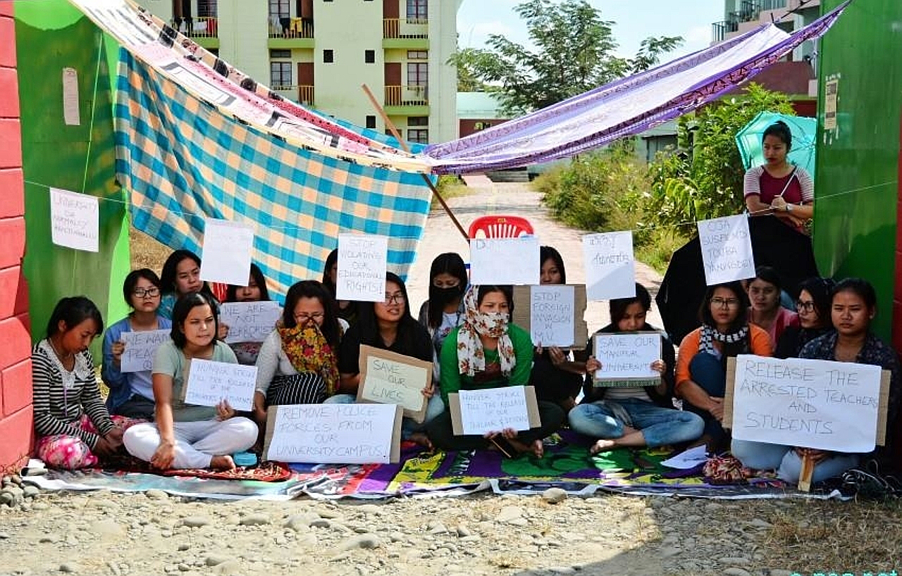 According to latest news, women students have started an indefinite hunger strike against the armed action. Joint Students’ Coordination Committee have called for total shutdown of the campus. No classes are taking place. Manipur University Students’ Union have boycotted the examinations. College and schools students protested against the armed action in Imphal on the 25th and 26th of September demanding release of the arrested people. Three students from Dhanamanjuri College have been arrested for protesting on the 26th of September. All Manipur Students’ Union (AMSU), Students’ Union of Kangleipak (SUK), Kangleipak Students’ Association (KSA), Democratic Students’ Alliance of Manipur (DESAM), Manipur Students’ Federation (MSF) and Apunba Ireipak Maheiroi (AIMS) called a 48 hours long General Strike starting from the midnight of 26th September. Civil society organisations and women organisations have supported the general strike.
