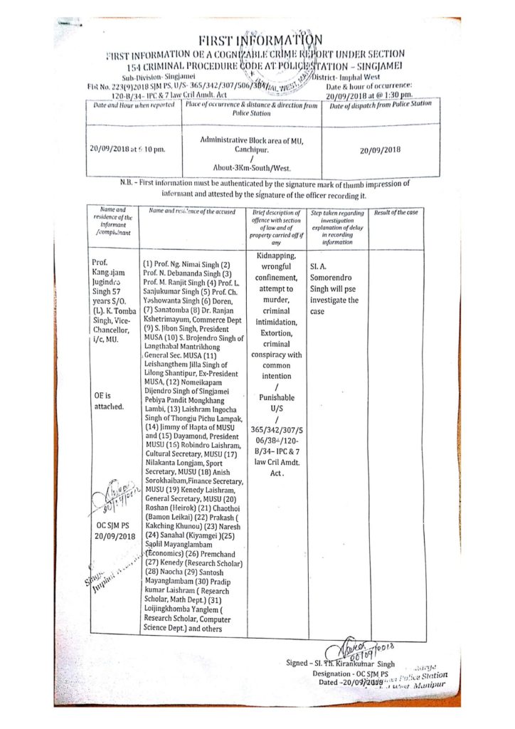 Pandey, on the 10th of September, appointed Y Yugindro as provisional-VC. The provisional VC entered in the University on the 20th of September along with large number of security forces. Students gheraoed him. The gherao was successful and under mounting pressure, the Pro-VC left the University (though he is now back into the campus). He then immediately went to the Chief Minister’s office where he named many individuals. Police filed an FIR based on his complaint. The complaint mentions that the students attacked him with sticks and stones, with the intent to kill him. The FIR mentions ‘attempt to murder’. However, Pro-VC Y Yugindro, himself, claimed on Impact TV that he was attacked with eggs. Two eggs hit his vehicle. He also reported in local news media that CM wanted to take action because “the situation has become embarrassing for him and the Center is scolding him.”