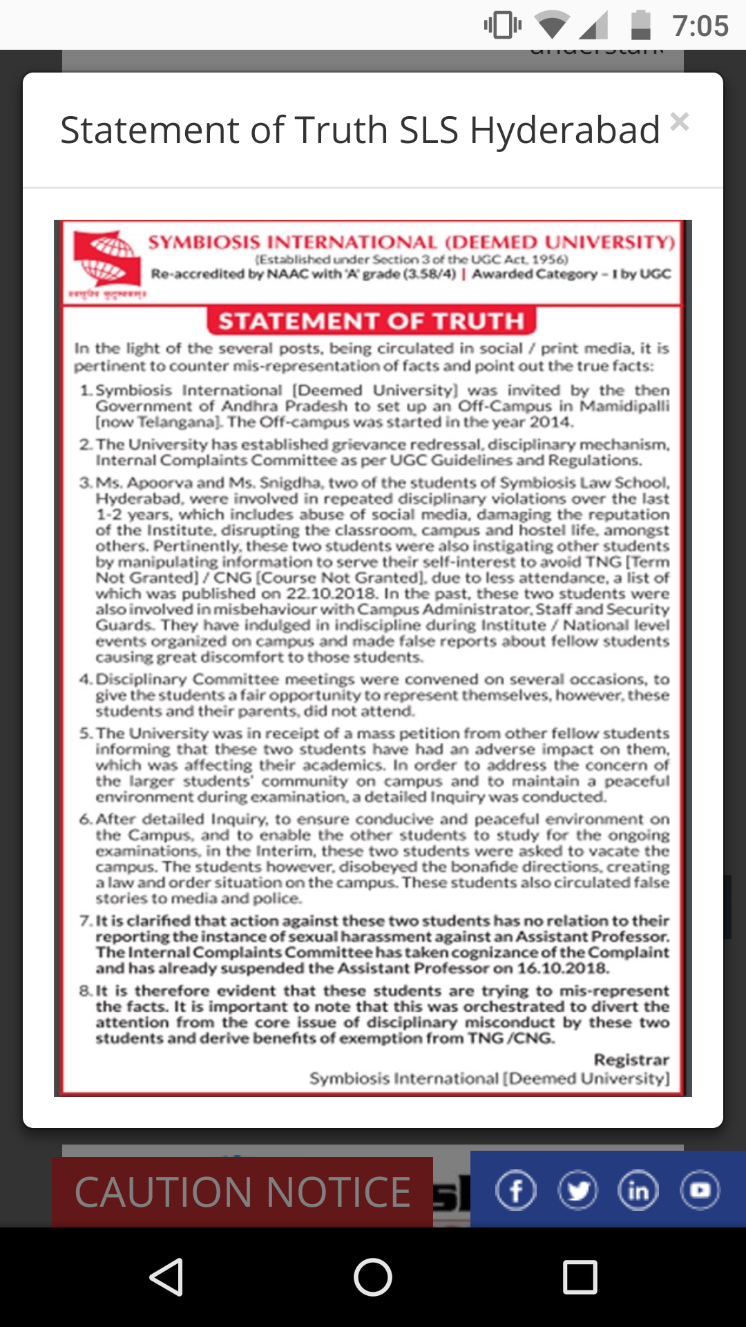Joint statement by Apoorva Y.K and Snigdha JayakrishnanWe are 4th year students of Symbiosis Law School Hyderabad. We…
