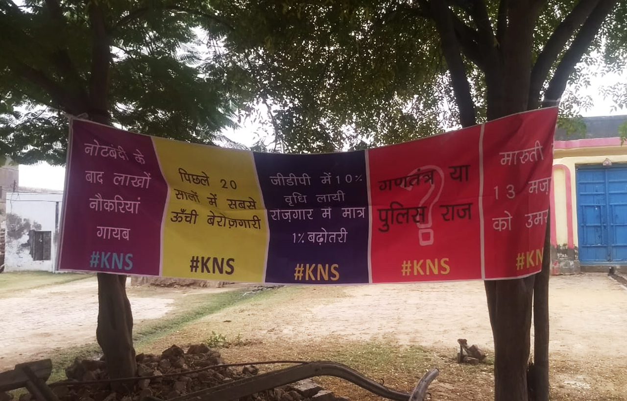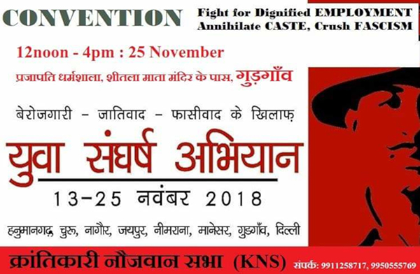 Krantikari Naujawan Sabha (KNS), a leftist youth organization, took out a 14-day Padyatra named Yuva Sangarsh Abhiyan, across Rajasthan, Haryana and Delhi. The Yatra by KNS, campaigning against unemployment, communalism and casteism with a call to crush rising fascism in the country, started on 12th evening in northern Rajasthan’s Hanumangarh district and travelled southwest to Churu and Naguar before reaching Jaipur. From Jaipur the campaign travelled into the industrial belt of Neemrana, Dharuhera and Manesar and on 21st Nov it reached Wazirpur in Delhi. From there they marched to Gurgoan. The 14 day campaign through various street corners, factory gates, basti commons, villages and small towns will culminate tomorrow in a convention in Gurgaon on Sunday, 25th November.