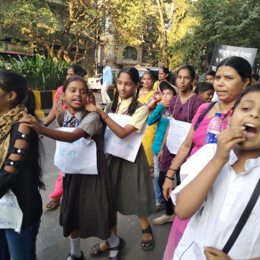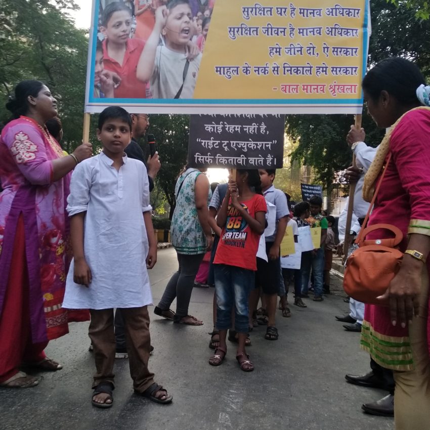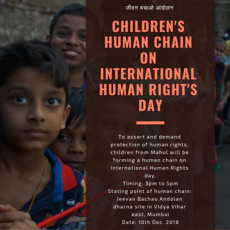 On 10th December, the International Human Rights day, the residents of Mahul in Mumbai, led by the children took out a rally from their dharna site next to the VidyaVihar Tansa pipeline, demanding right to life and right to housing. The ongoing dharna of thousands of people asking for relocation to proper rehabilitation quarters stepped into its 44th day on this day. A GroundXero report. You can read our ongoing coverage of the Mahul agitation here: “Evicted Mumbai slum residents occupy footpath as protest”, “Mahul Residents Continue Protest, Demand Rehabilitation for All, Show Black Placards to CM Fadnavis”, “Women Lead Mumbai Anti-Eviction Struggle: Four Interviews”, “Mahul : Children Protest for Right to Childhood”.