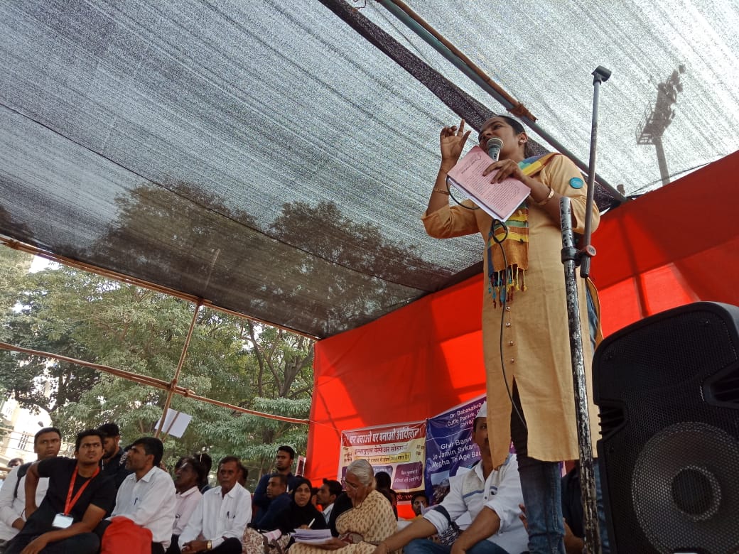 Around 24 organisations working across the city against slum demolition drives came together to share the stage. “The Government does not care about us. This is the 50th day of the protest. They haven’t raised our issue in the Assembly session. We don’t want a Government that does not listen to the issues of its people. They know that they can’t shoot us down since that would become a scandal. They know they can’t bulldoze us because that will become a scandal as well. So they have decided to leave us in Mahul, to die. We will not get up from here. When this Government came to power in Maharashtra, they claimed they’d turn it into Singapore… We will occupy this maidan, make some khichdi for us here, make some small schools for the children, some small centers for women. When the punjipatis (capitalists) don’t have limits to occupy our land, why should we?” said Jameela Begum, one of the activists with the Ghar Bachao Ghar Banao Andolan – the group coordinating the struggle of the Mahul residents. People were repeatedly cautioned to vote against the BJP in the upcoming elections.