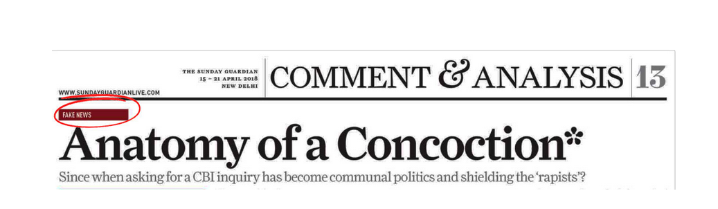 Here we cite only a few representative examples of this “hate-mongering” and “fake news spreading” – new norms for the News industry of 2018. In April, The Sunday Guardian published an opinion piece by someone called Sushil Pandit claiming that there was no rape in Kathua. This piece was published under a sub-header explicitly called ‘Fake News’! The article also came with a footnote that said “* This article is a pure concoction based on fiction. Any resemblance with any character or event is unintentional and coincidental.” This was perhaps the first such example of a news agency officially publishing fake news.