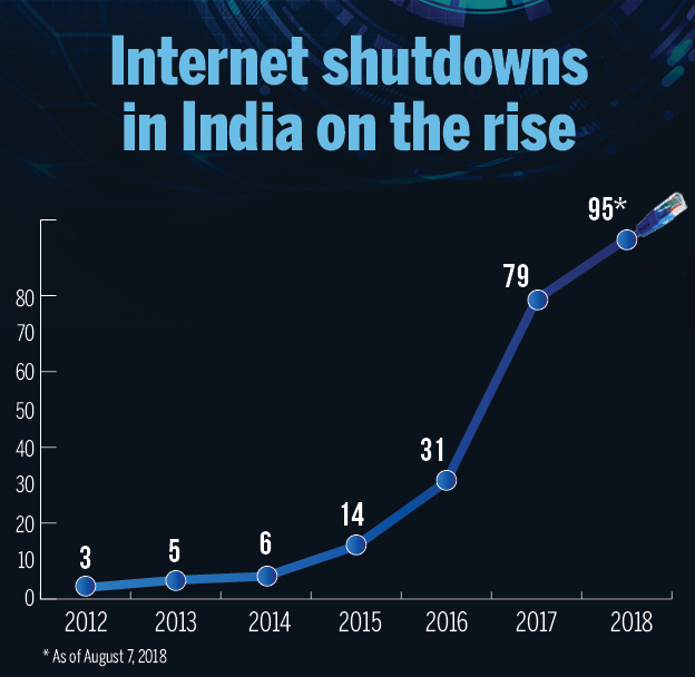 According to the latest Freedom on the Net report published in November, India led the world in 2018 in the number of Internet shutdowns. From January to mid-August 2018, local authorities ordered service providers to temporarily shut down Internet access in at least 96 reported incidents in 19 states, the report said. This number was 70 in 2017.