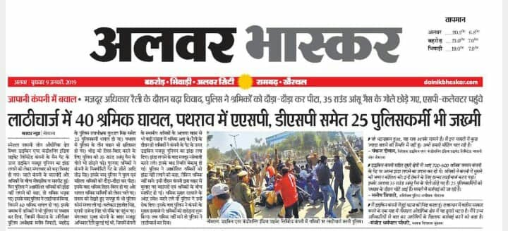 Daikin Air Conditioning Mazdoor Union (Registration Number JT/ARTU/28/2018) issued a Statement on the Strike and repression on 8th January 2019, condemning the brutal attack by the police and the company hired goons. They said it was an attempt to crush the 5 year long struggle of Daikin workers and other workers’ struggles in Neemrana industrial area.