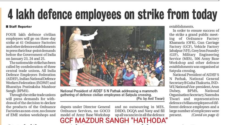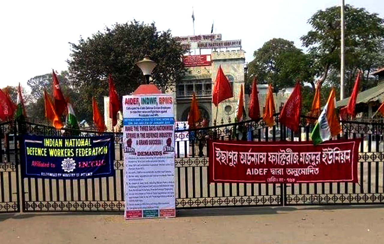প্রায় ৪ লক্ষ অসামরিক প্রতিরক্ষা কর্মী ২৩ জানুয়ারি থেকে ২৫ জানুয়ারি পর্যন্ত ৩ দিনের ধর্মঘটে যোগ দিয়েছেন। একদিকে সরকারি প্রতিরক্ষা বিভাগের অবস্থা শোচনীয় ও অন্যদিকে বিজেপি সরকার প্রতিরক্ষা পণ্য তৈরির দেশীয় বিভাগগুলোকে বেসরকারি ও বহুজাতিক কর্পোরেটদের হাতে তুলে দিচ্ছে। এর বিরুদ্ধেই তাঁদের প্রতিবাদ। সেই সঙ্গে তাঁদের লড়াই ন্যায্য পেন্সনের অধিকারের সপক্ষেও। অল ইন্ডিয়া ডিফেন্স এম্পলয়িজ ফেডারেশন (এ.আই.ডি.ই.এফ), ইন্ডিয়ান ন্যাশনাল ডিফেন্স ওয়ার্কার্স ফেডারেশন (আই.এন.ডি.ডব্লু.এফ) ও সঙ্ঘ পরিবারের শাখা শ্রমিক সংগঠন ভারতীয় প্রতিরক্ষা মজদুর সংঘ (বি.পি.এম.এস) যৌথভাবে এই ধর্মঘটের ডাক দেয়।